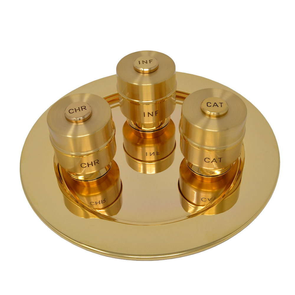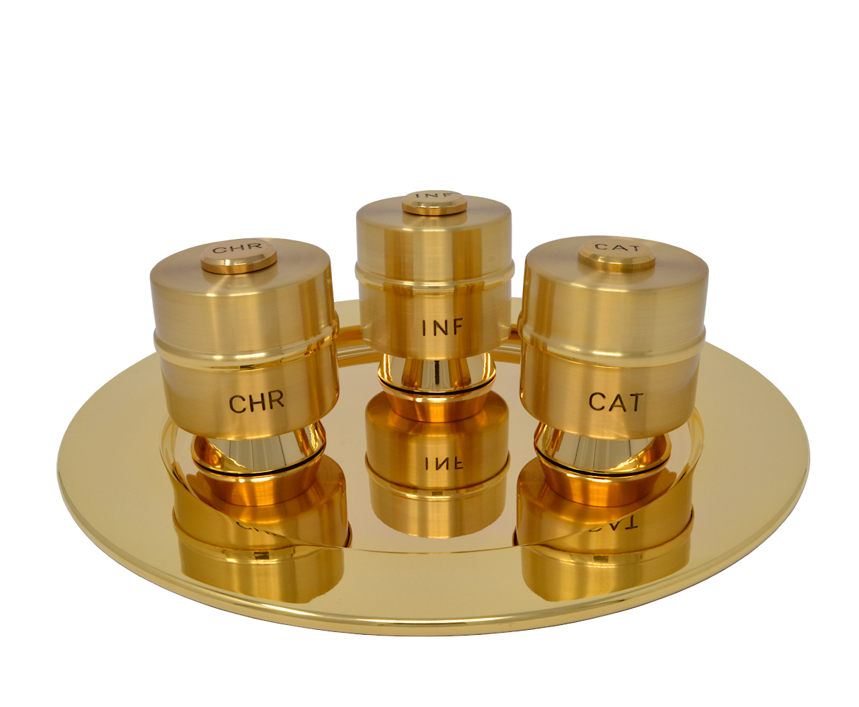 Set mit den 3 Heiligen Ölen auf einer Platte, Durchmesser der Garnitur: 23,5 cm, Höhe: ca 8 cm. Die Gefäße werden durch einen Schraubverschluß verschlossen. Die Oberflächen sind vergoldet. Die Bezeichnung der Inhalte befindet sich auf dem Gefäß und auf dem Deckel.