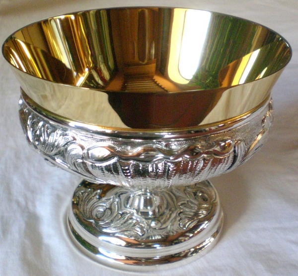 Hostienschale, Messing, Fuß und Cupafang versilbert, Cupa vergoldet, Höhe 11 cm, Cupa Durchmesser 15 cm