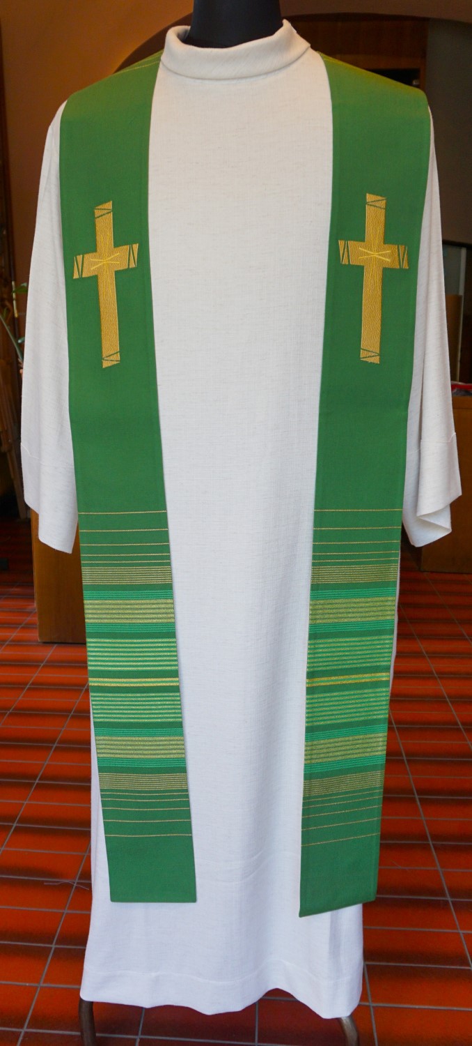 grüne Aussenstola gefüttert, 2 eingewobene moderne Kreuze, quere Goldlurexstreifen im unteren Teil der Stola,
