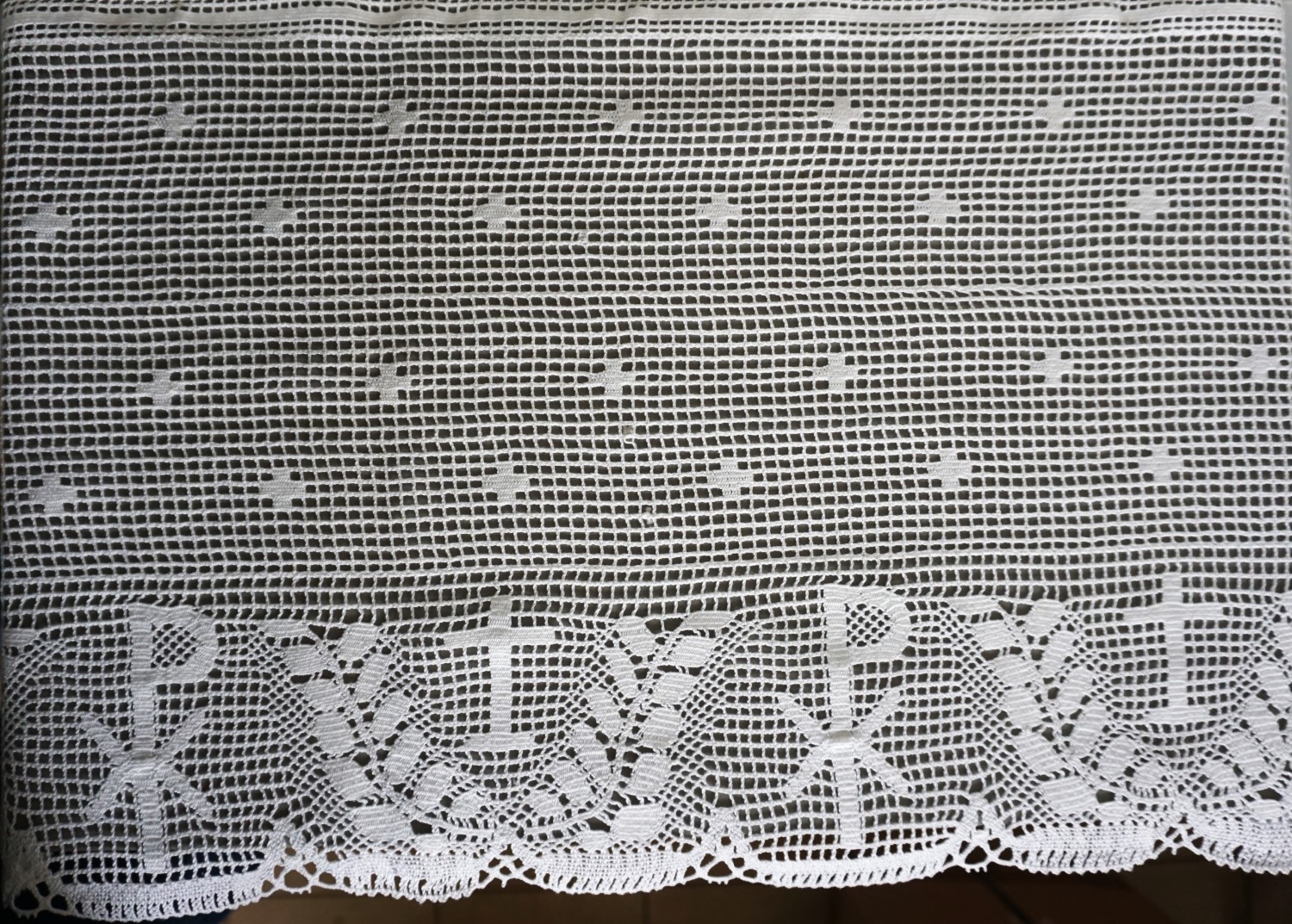 weisse Baumwollspitze, Breite 34,5 cm Länge: 4,8 m, Motive: Sterne, am unteren Rand PAX Zeichen und Kreuze, geeignet für ein Altartuch oder als Albenabschluß