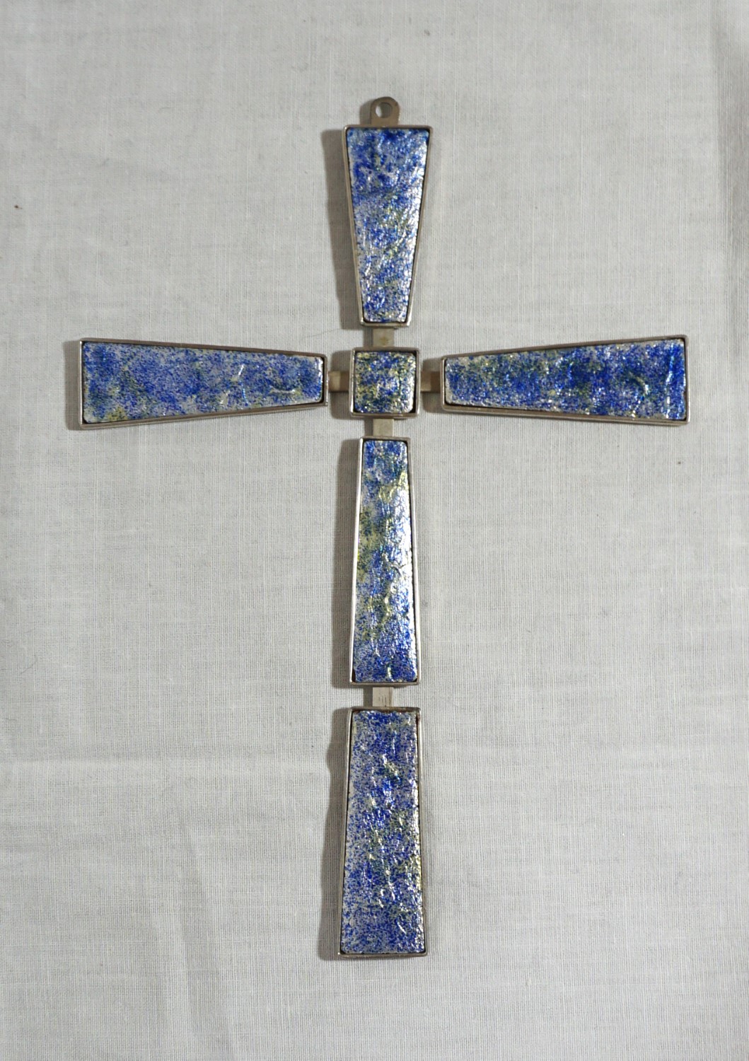 modernes Wandkreuz, Emailarbeit mit 6 Emailflächen, Kreuzhöhe: 20 cm, Kreuzbreite: 15 cm. Das Kreuz an der Wand aufzuhängen