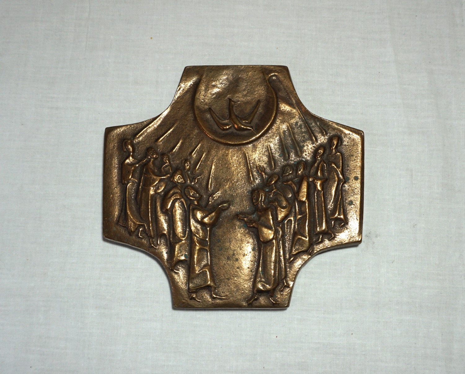 Bronzeplakette mit Motiv Heiliger Geist mit den 12 Aposteln, Firmung, Maße: ca 16,5 x 16,5 cm, auch zum Aufhängen an der Wand