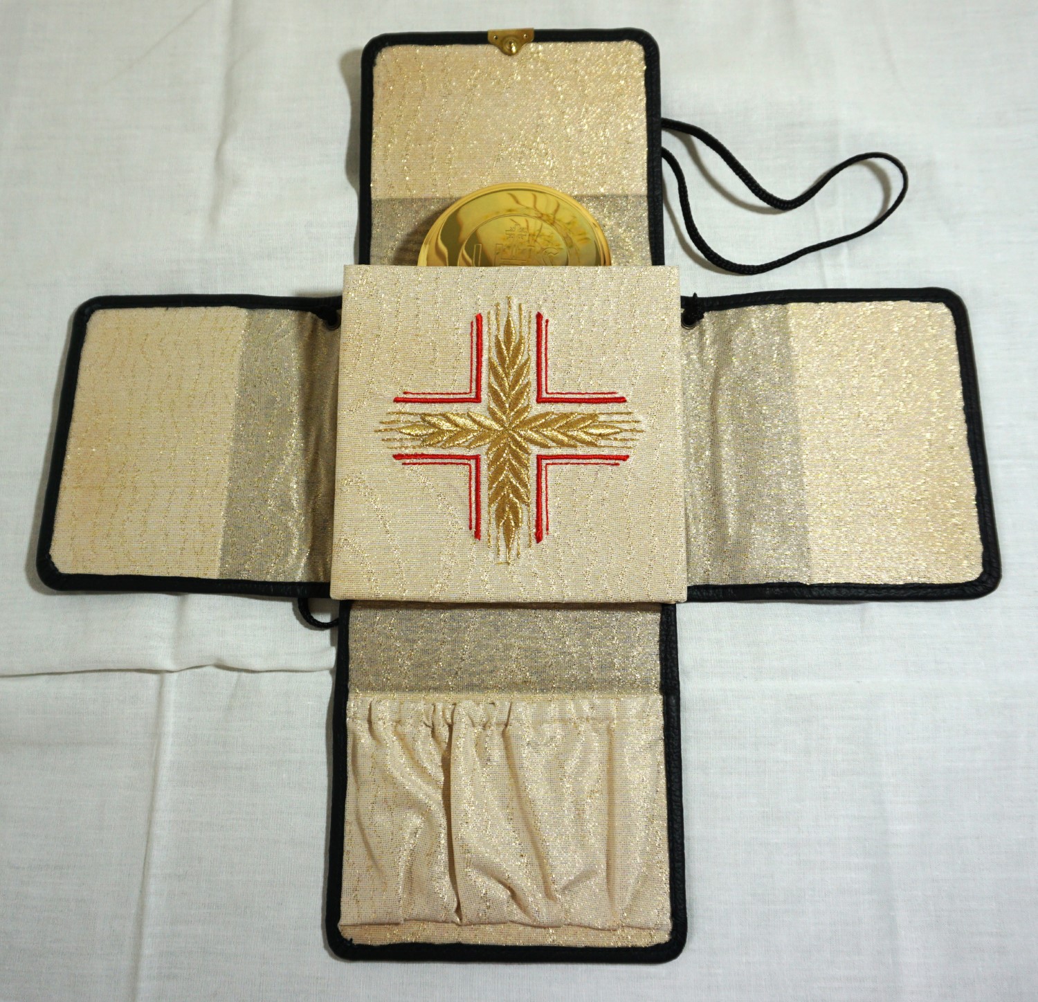 Umhängeburse aus Kunstleder, aufklappbar und durch einen Druckknopf wieder verschließbar. Innen gefüttert, Tasche für Hostiendose. Auf dieser Tasche ist ein Symbol für das Weizenkorn eingestickt. Eine weitere Tasche für ein Coporale ist eingearbeitet. Maße: ca 15 x 15 cm.