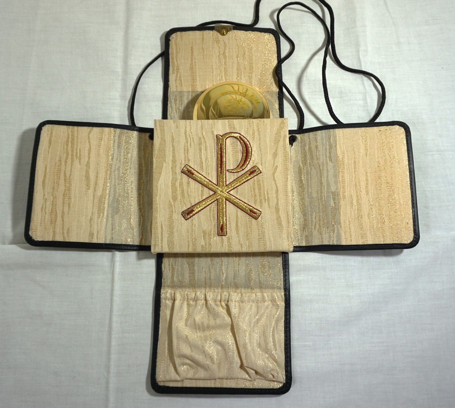 Umhängeburse aus Kunstleder, aufklappbar und durch einen Druckknopf wieder verschließbar. Innen gefüttert, Tasche für Hostiendose. Auf dieser Tasche ist ein PAX Zeichen eingestickt. Eine weitere Tasche für ein Coporale ist eingearbeitet. Maße: ca 15 x 15 cm.