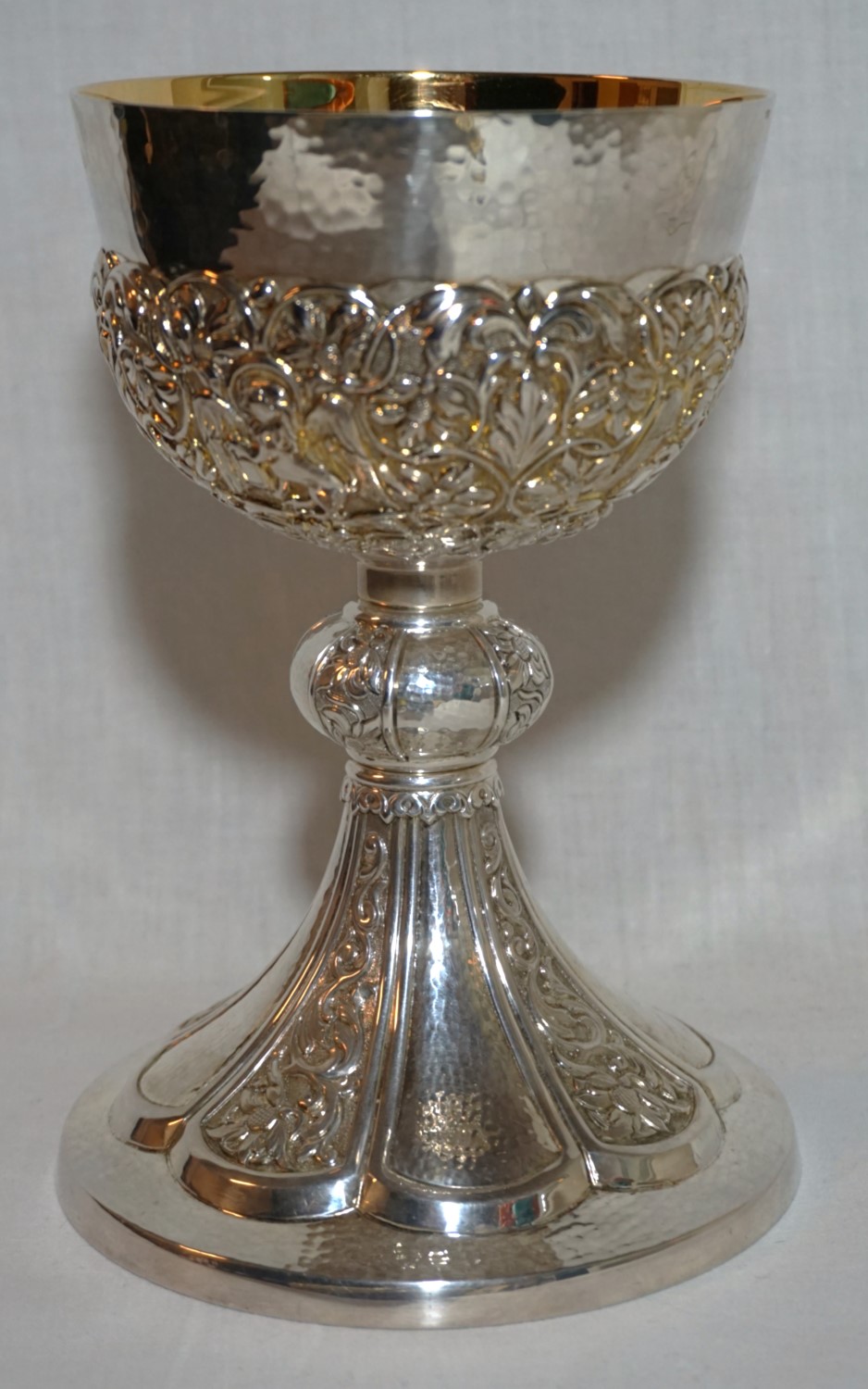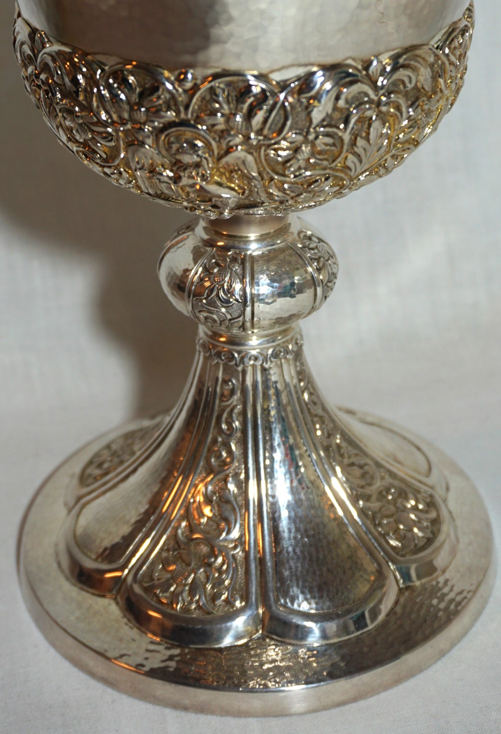 dieser Kelch ist aus Sterling Silver hergestellt, Höhe: 20 cm, Cupadurchmesser: 12 cm. Der Cupafang ist mit der Darstellung der 4 Evangelisten, eingebettet in florale Darstellungen, gearbeitet. Die Außenseite der Cupa, der Nodus sowie der Fuß sind gehämmert. Beigefügt ist 1 Tellerpatene mit einem Durchmesser von 17 cm. Der passende Kelchkoffer ist im Preis inbegriffen. Der Kelch ist ganz wenig gebraucht.