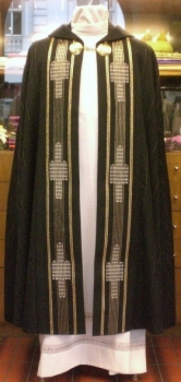 schwarzes Pluviale mit Kreuzmotiven auf Vorder- und Rückseite mit Silberfaden eingewoben, Schließe versilbert mit Alpha u. Omega Zeichen, gefüttert, Stoff: Schurwolle/Trevira Gemisch, Länge: ca 135 cm