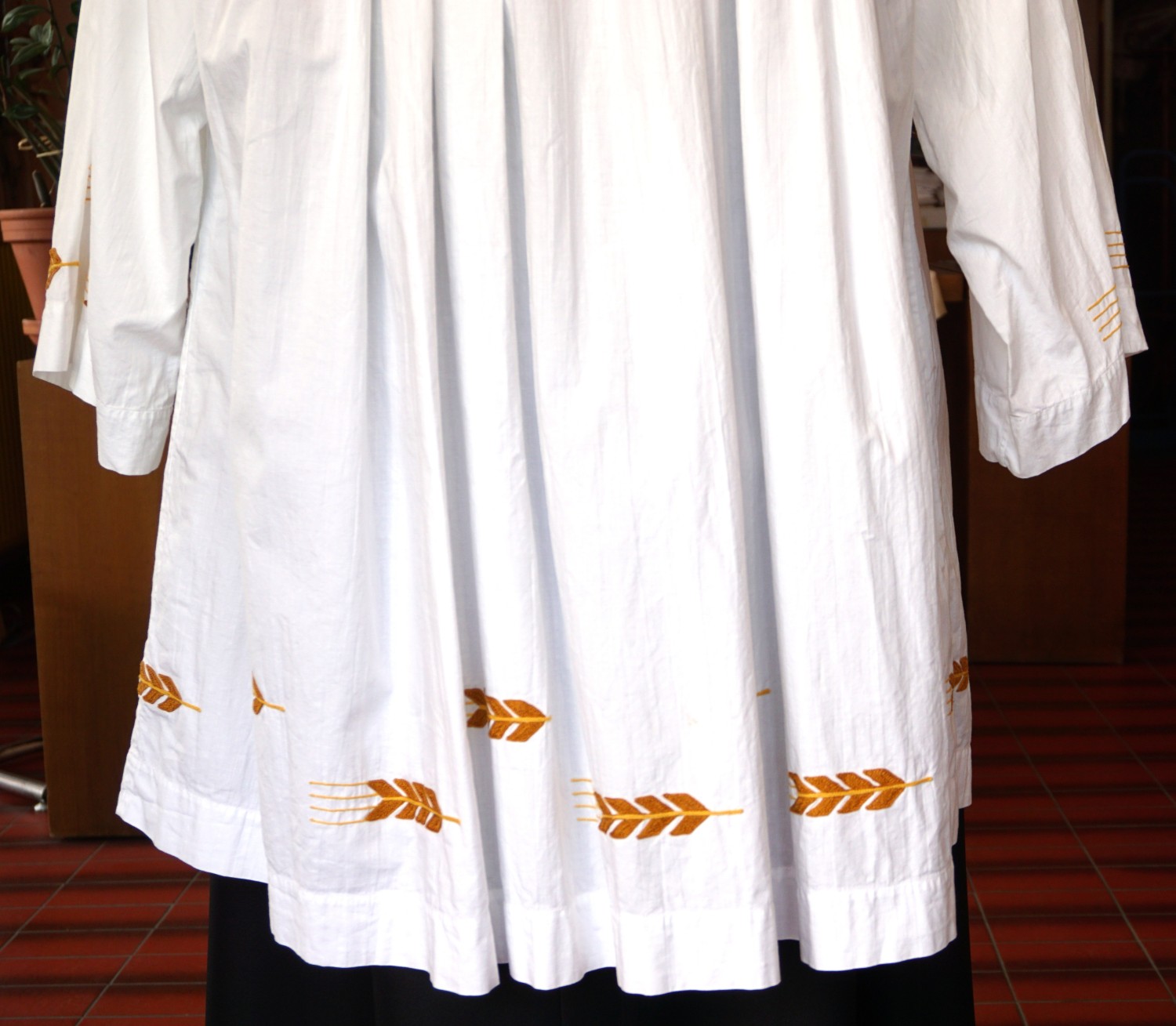 Chorrock aus Webe mit gezogenen Falten, Länge: 105 cm. Am unteren Saum sowie am Ärmelsaum sind Ährenmotive mit gelb/braunem Faden eingestickt. Einzelstück.