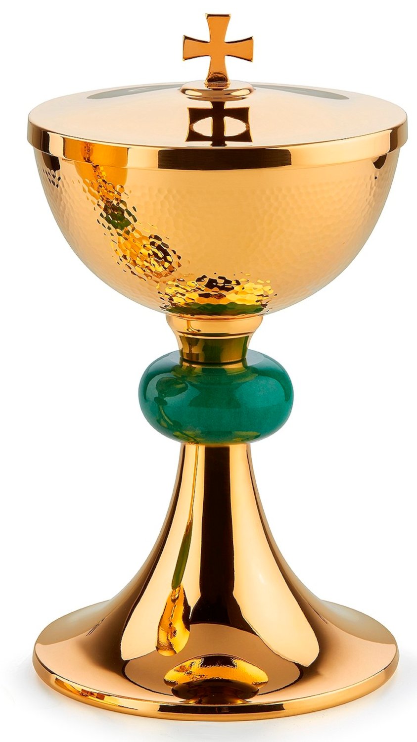 Ciborium aus Messing, vergoldet, Cupa außen gehämmert, Kreuz am Fuß, Jadehalbedelstein als Nodus, Höhe: 21 cm, Cupadurchmesser: 11 cm