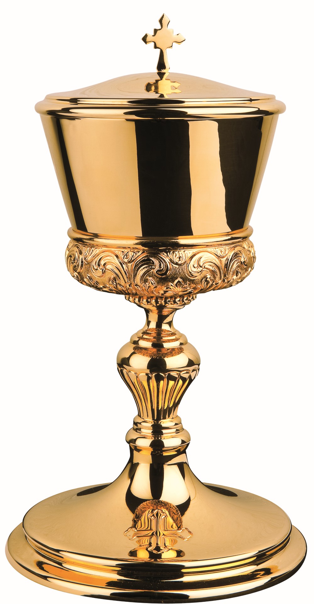 Ciborium aus Messing, vergoldet, florale Ornamentik auf dem Cupafang, Höhe: 23 cm, Durchmesser: 10 cm