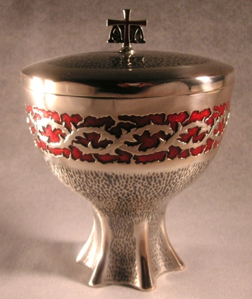 Ciborium: Höhe: 17,5 cm, Durchmesser: 13 cm, Oberfläche gehämmert und bearbeitet, Dornenkronenmotiv auf rotem Emailband gearbeitet, Cupa innen vergoldet, Kelch außen versilbert