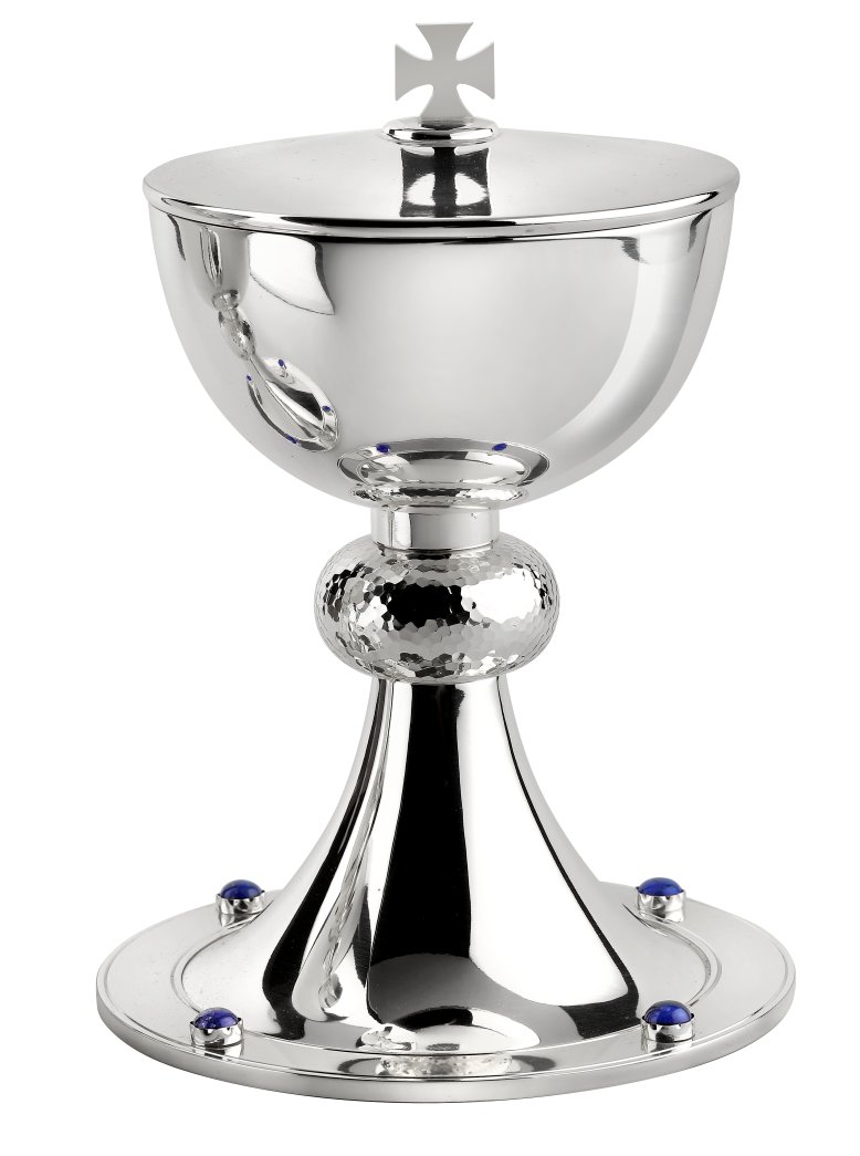 Ciborium aus Messing, versilbert, Cupa und Deckel jeweils innen vergoldet, Höhe: 20 cm, Cupadurchmesser: 12 cm, 4 x lapis lazuli