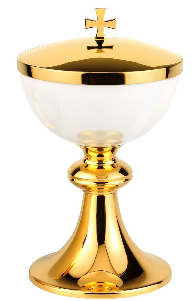 Ciborium, Cupa außen gebranntes Email, Innenseite vergoldet, Rest Messing vergoldet, Höhe: 20 cm, Cupadurchmesser: 12 cm