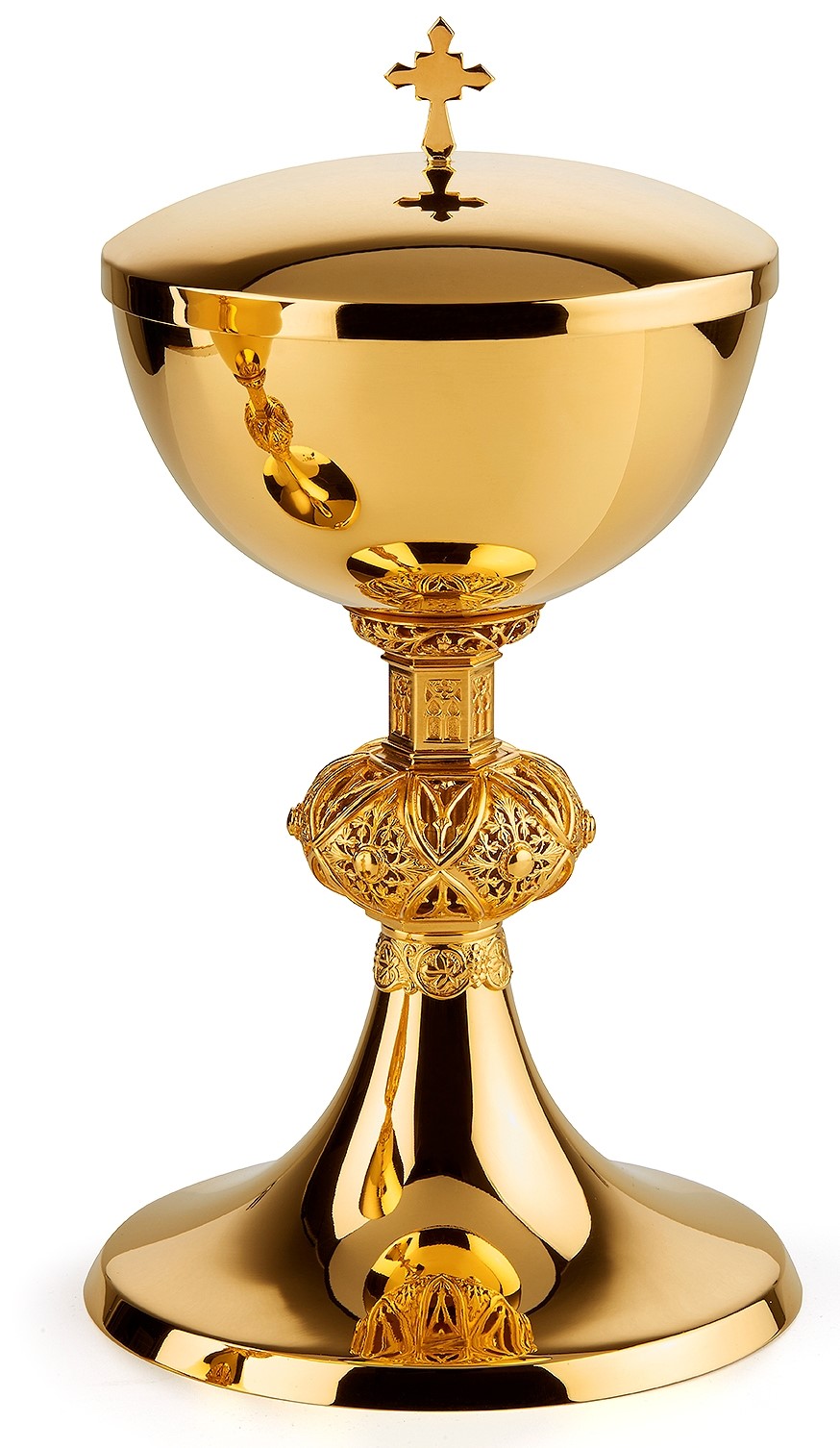Ciborium aus Messing, vergoldet, poliert, Nodus mit Ziselierarbeit, Höhe: 23 cm, Cupadurchmesser: 14,4 cm
