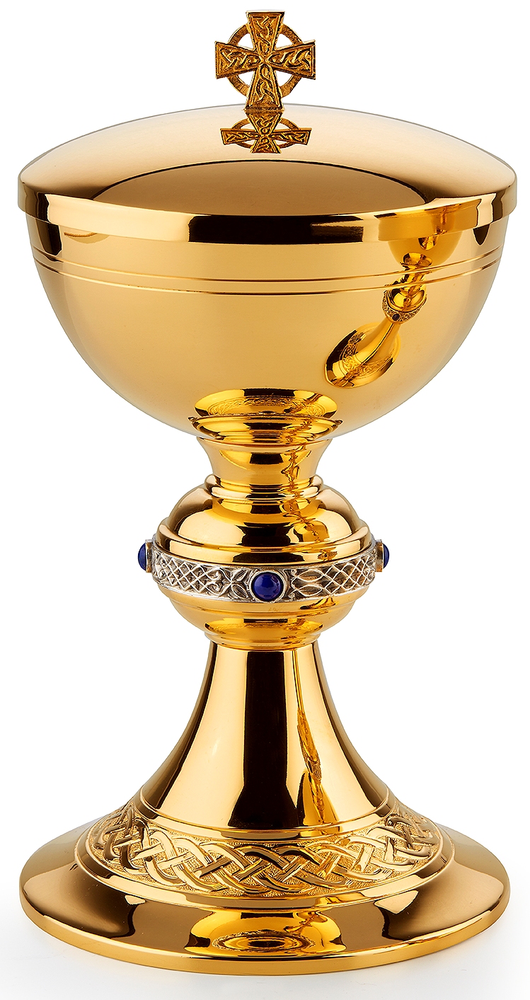 Ciborium aus Messing, vergoldet. Ziselierarbeiten am Fuß und um den Nodus. Dort hält ein silbernes Band 4 Steine Lapislazuli, Höhe: 22,5 cm, Cupadurchmesser. 11,7 cm