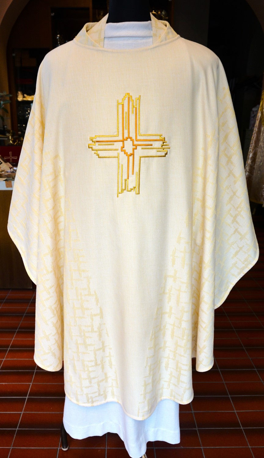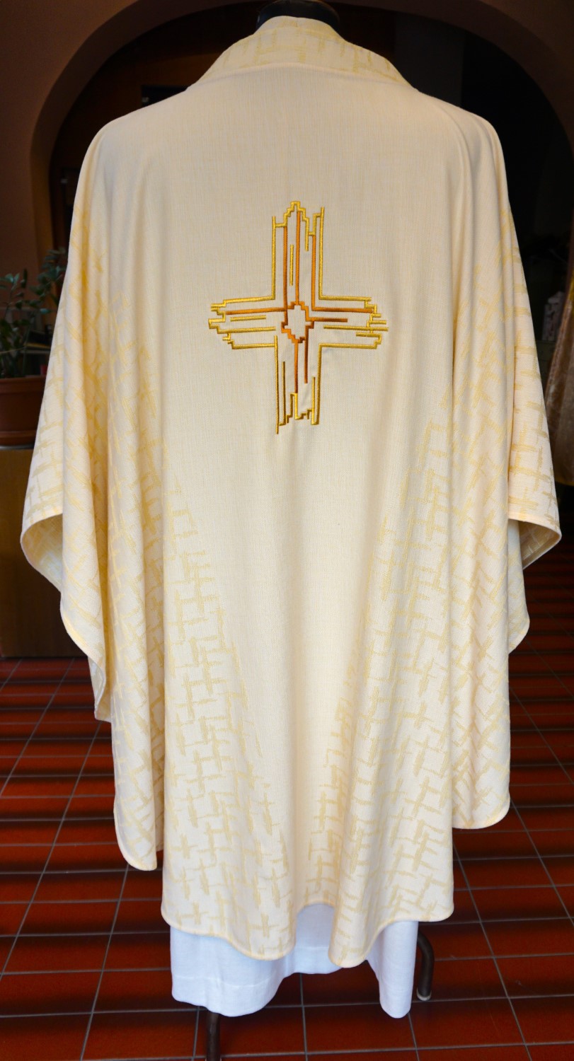 Kasel aus leicht creme/weißem Schurwoll/Trevira Stoff. Die mit Goldfaden eingestickten Kreuze auf Vorder- und Rückseite sind durch im Stoff eingewobene Kreuze eingefaßt