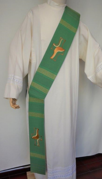 grüne Diakonstola, moderne geschwungene Kreuze eingestickt, gefüttert, Stoff: Schurwolle/Trevira Gemisch