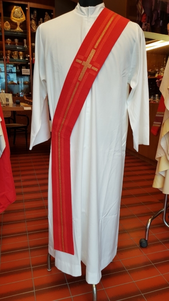 rote Diakonstola mit Kreuzmotiv auf Vorder- und Rückseite eingewoben, teilweise mit Godfaden, gefüttert
