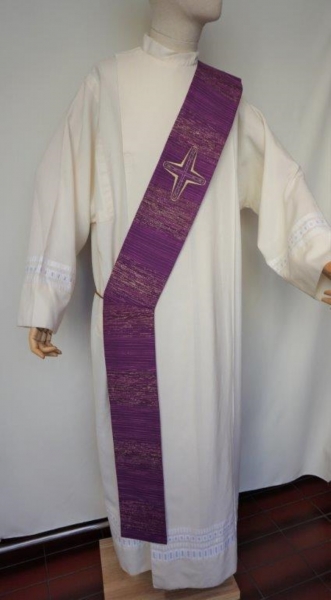 violette Diakonstola, Kreuze eingewoben, gefüttert, Stoff: Schurwolle/Trevira Gemisch, Lurexfäden