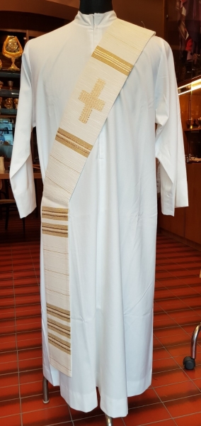 weiße Diakonstola mit Kreuzmotiv auf Vorder- und Rückseite, gefüttert