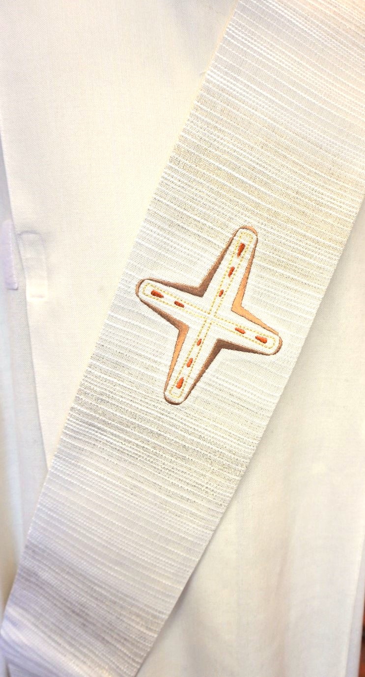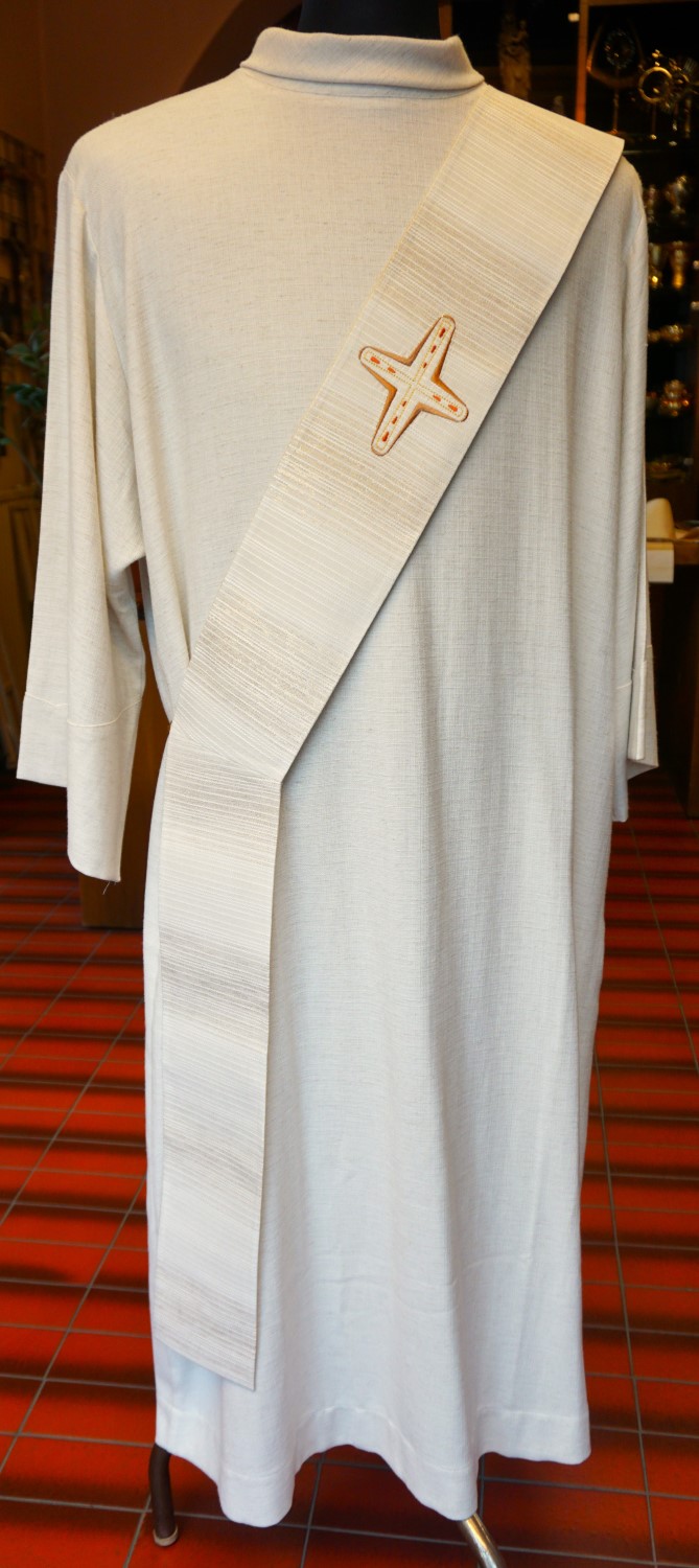 weiße Diakonstola mit eingewobenem Kreuz auf der Vorderseite und am Rücken, gefüttert, Stoff: Schurwolle/Trevira Gemisch, goldene Lurexfäden