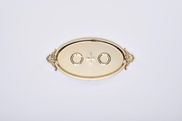 Eheringtasse Messing vergoldet, mit 2 Griffen, 27,5 x 14 cm, oval, Ringhalterung, Kreuz