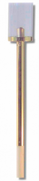 Flambeauxstab aus Messing, unterer Teil aus hellem Holz., Höhe: 100 cm. Der Betrieb ist mit einer Kerze oder auch mit einer Ölkartusche möglich. Die Kartusche oder die Kerze werden von einer innen verschraubbaren Schraubkappe gehalten.