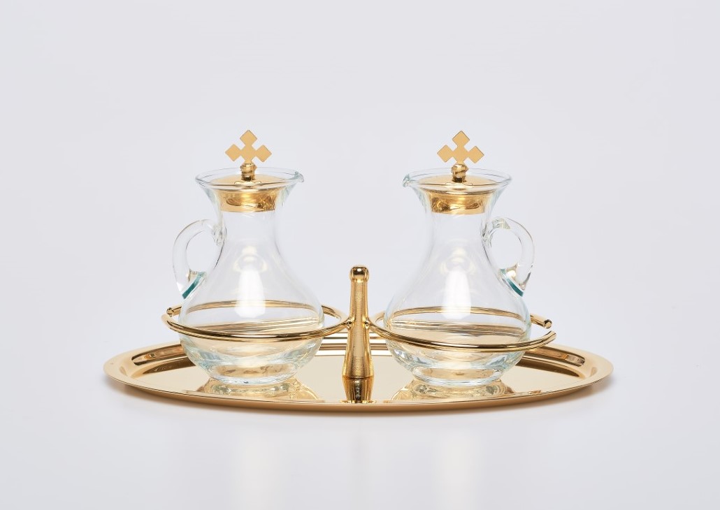 Wein und Wassergarnitur auf einem Tablett, mit Halterung für die Glaskännchen. Die Kännchen tragen jeweils einen eingelassenen Deckel, der als Griff ein Kreuz hat. Die Tablettmaße sind 23 x 14 cm, die Höhe des gesamten Gerätes beträgt ca 10 cm. Die Glaskännchen sind wiederbeschaffbar.