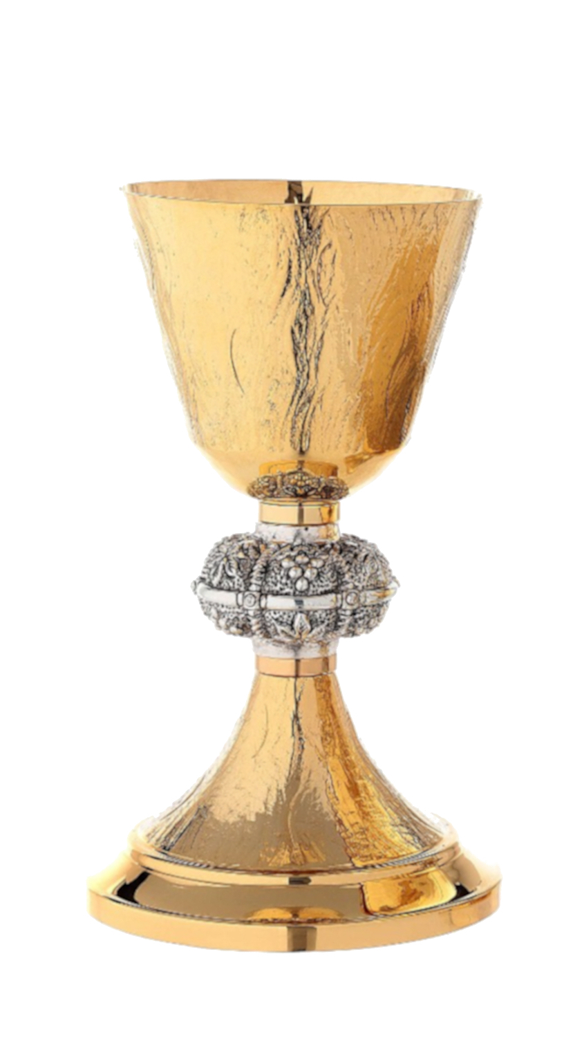 Kelch aus Messing, vergoldet, großteils mattiert, gehämmert, Nodus versilbert mit Weinsymbolik, Kelchhöhe: ca 20 cm