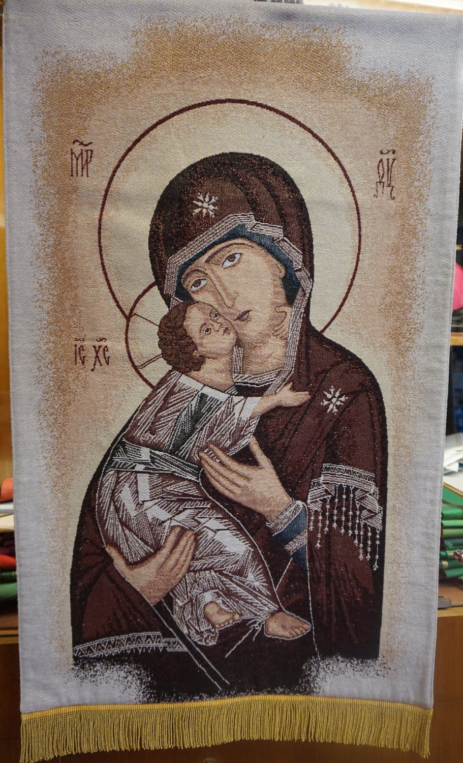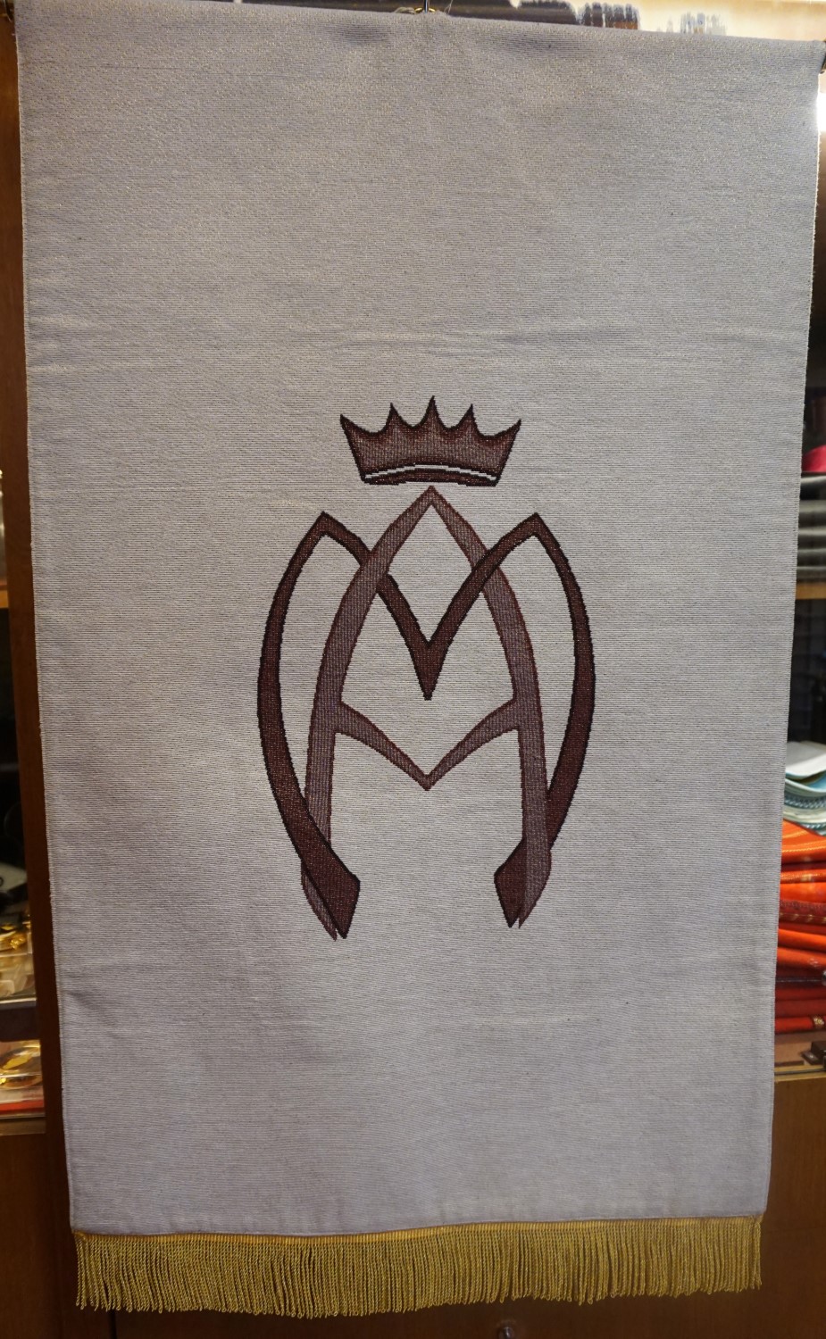 Die Fahne ist gewoben. Darstellung auf der Vorderseite: Maria mit Kind, auf der Rückseite; Marienzeichen mit Krone. Die Stofflächen sind mit feinen Goldlurxfäden durchzogen. Fahnenausmaß: 96 x 55 cm. Das untere Ende wird durch Gespinstfransen gebildet, die Fahne hängt an einer Messingstange, in deren Mitte sich ein Ring zum Aufhängen der Gesamtfahne befindet.