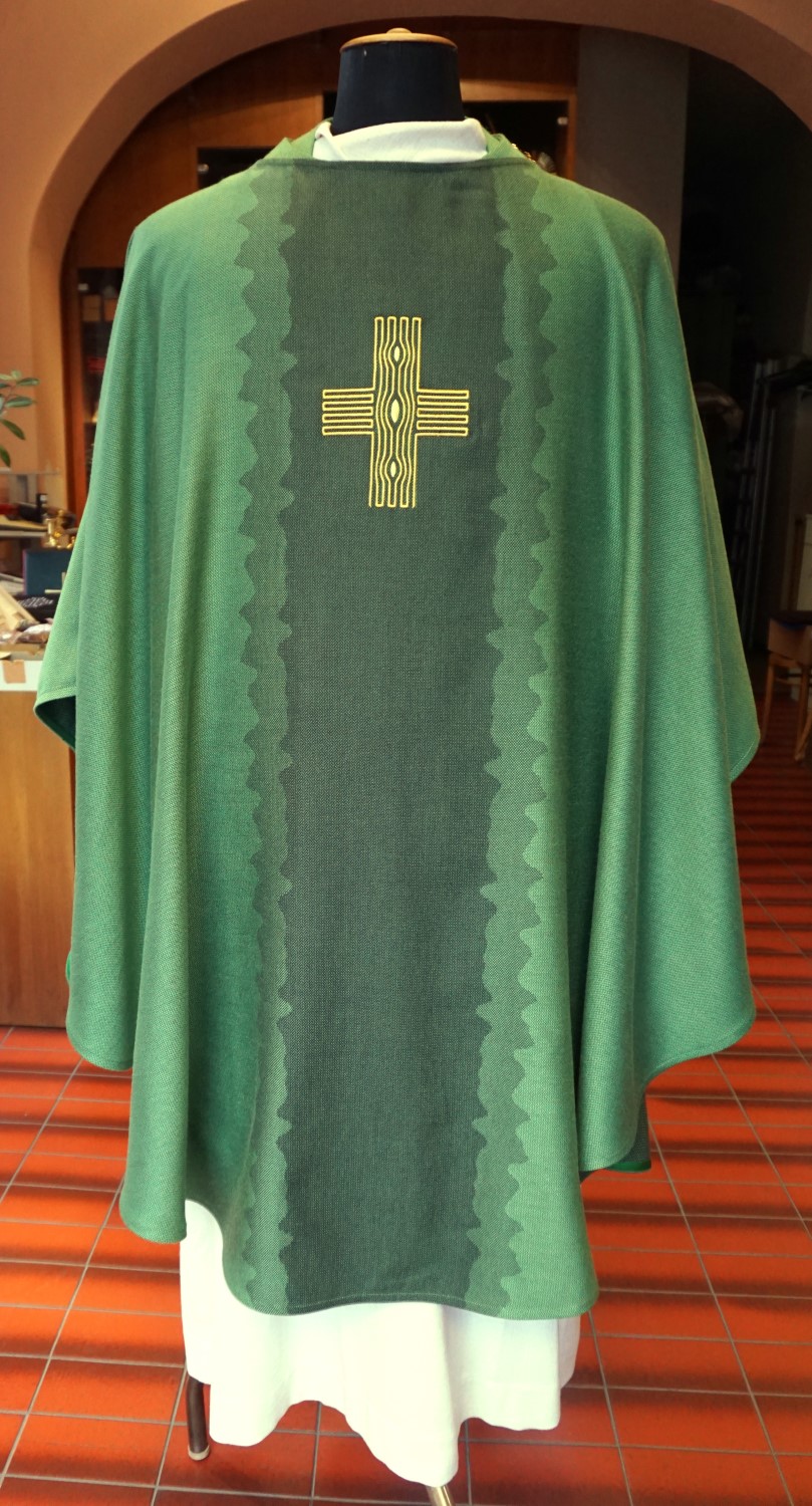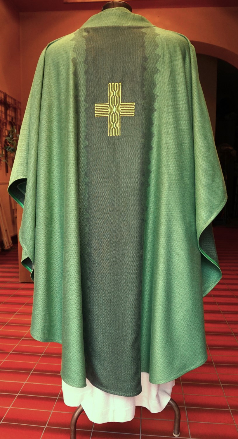 gotisches Messgewand in nach Außen heller werdenden Grüntönen. Auf der Brust- wie auf der Rückenseite ist jeweils ein Kreuz mit Goldfaden eingestickt. Der Messgewandstoff ist ein Schurwolle-Trevira Gemisch. Die Casel ist nicht gefüttert.