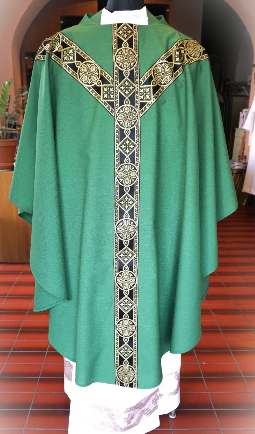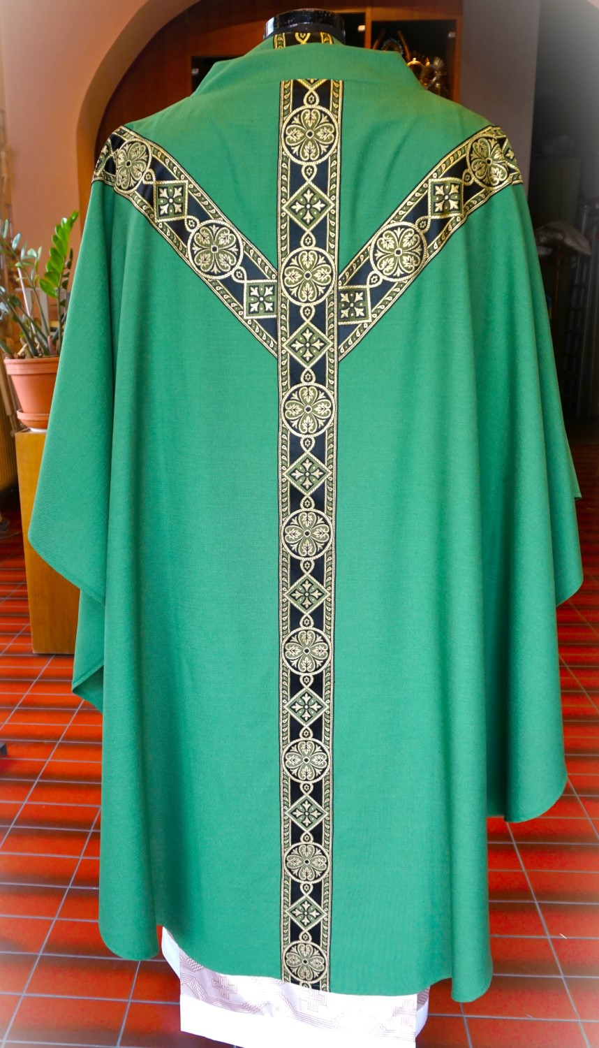 grünes Messgewand, ungefüttert, Andreas Kreuz mit Borten aufgenäht, Stoff: Wolle/Trevira Gemisch, Innenstola
