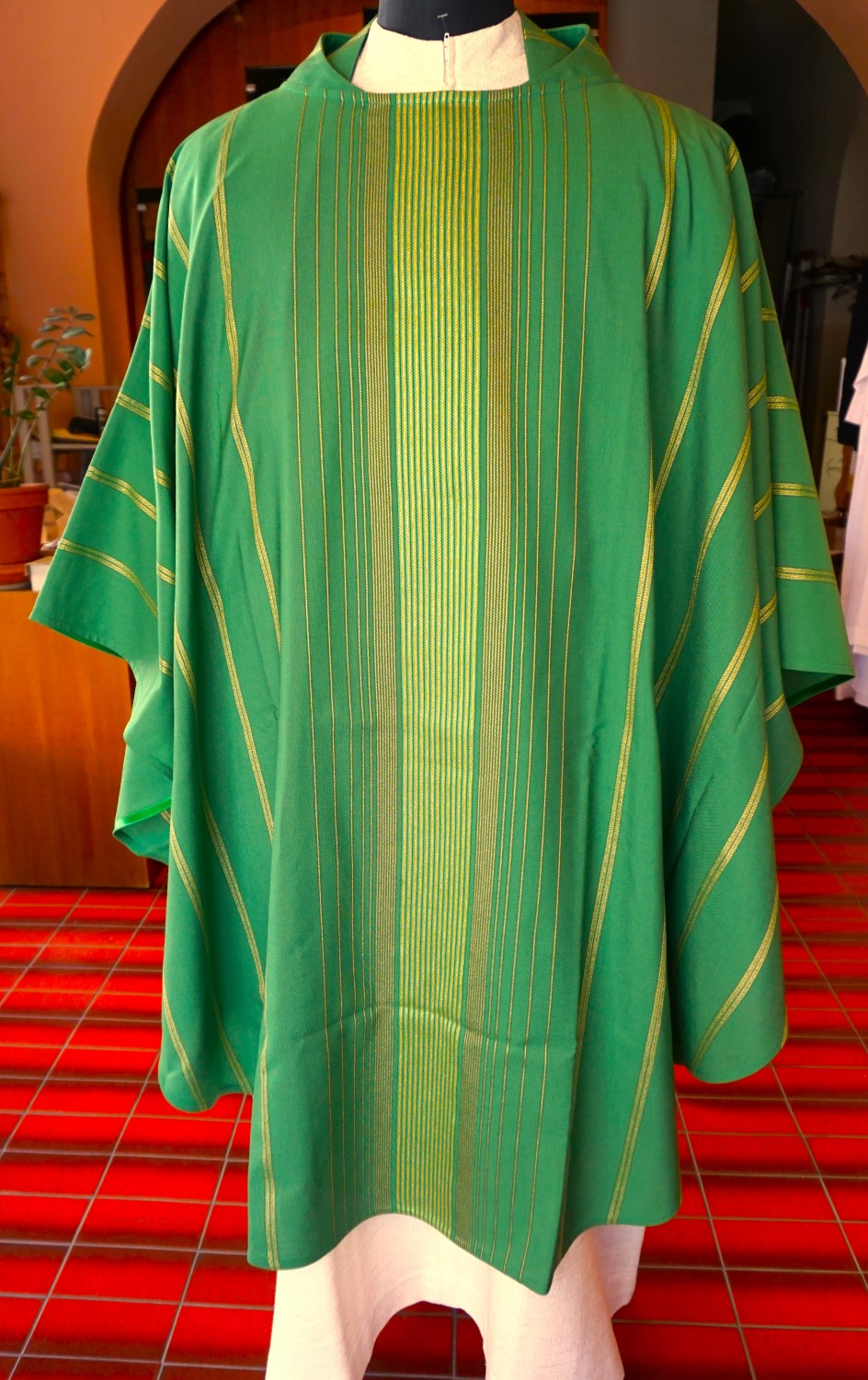 Casel aus einem Schurwoll/tTevira Gemisch, grün, die Längsstreifen sind mit Goldlurxfaden eingewoben, ungefüttert, leichtes Messkleid.
