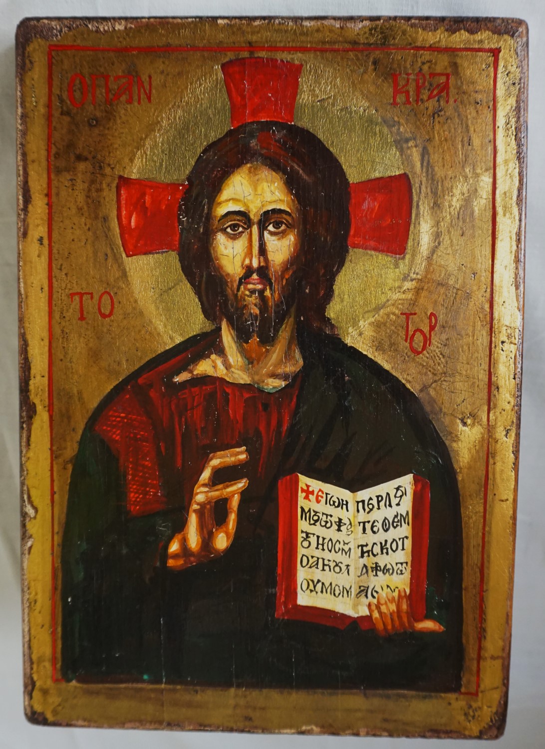 Ikone auf Holz gemalt, Darstellung Christi, Echtheitssiegel, Bildgröße: 18 x 26 cm, Alter unbestimmt