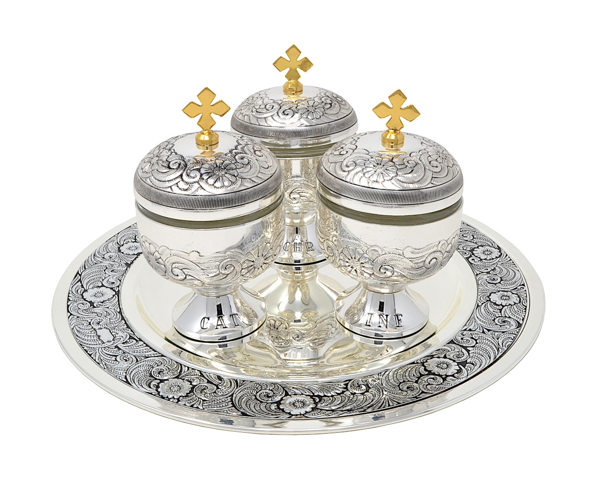 Dieses Set besteht aus 3 Behältern für die Heiligen Öle und 1 Tablett. Durchmesser: 24 cm, Höhe ca 8,5 cm. Die Außenoberflächen sind versilbert und mit Ziselierarbeit versehen. Auf den durch Schrauben abnehmbaren Deckeln befinden sich vergoldete Kreuze auch als Griff.