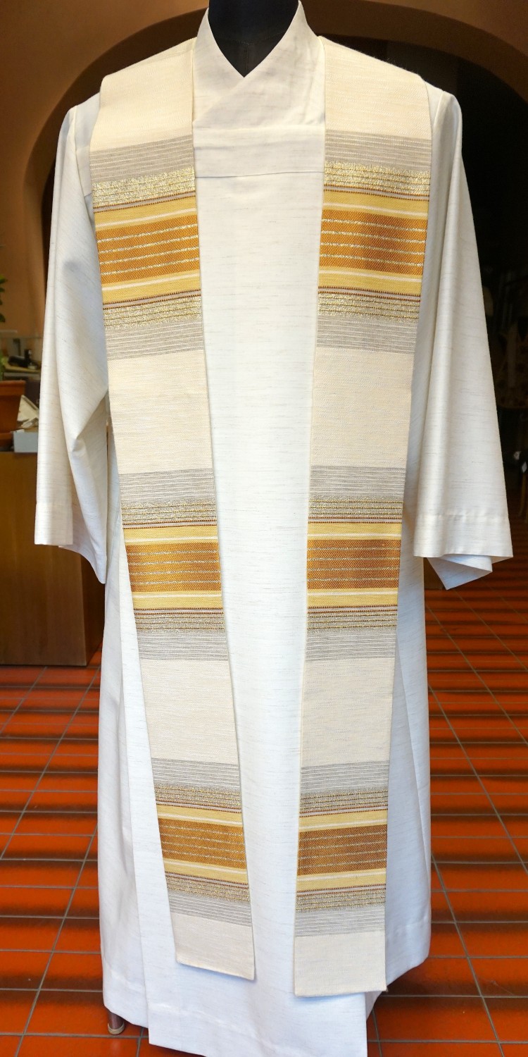 feieliche cremefarbene Außenstola mit Querstreifen in unterschiedlichen Gelb- Braun- Goldfäden, mit Seide gefüttert. Stoff: Schurwolle/Trevira Gemisch. Die Stola ist ganz wenig getragen