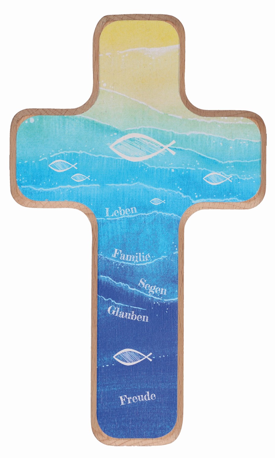Das Kreuz ist aus Buchenholz, farbig bedruckt, Höhe: 18 cm. Motiv: der Fisch. Kann auch an der Wand aufgehängt werden.