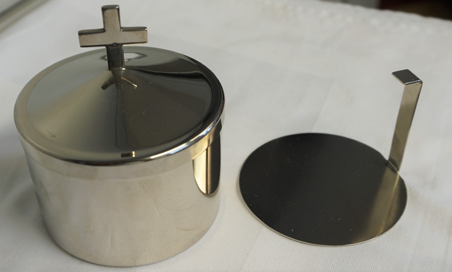 Die Hostiendose ist aus Messing, vernickelt. Als Deckelgriff dient ein Kreuz, Maße: Höhe: 7,5 cm (ohne Kreuz), Durchmesser: 8 cm. Dient zur Aufbewahrung von Priesterhosteien. Um diese leichter aus der Dose herauszubekommen befindet sich ein herausnehmbarer Hostienheber mit Griff in der Dose