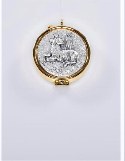 Hostiendose, vergoldet, Symbolfläche: Lamm Gottes/Auferstehung, Klappverschluß, Durchmesser: 5,4, Höhe: 1,9 cm