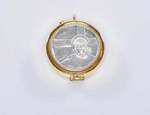 Hostiendose, vergoldet, Symbolfläche Christus mit dem Kreuz, mit Klappverschluß, Maße: 5,4 x 1,9 cm