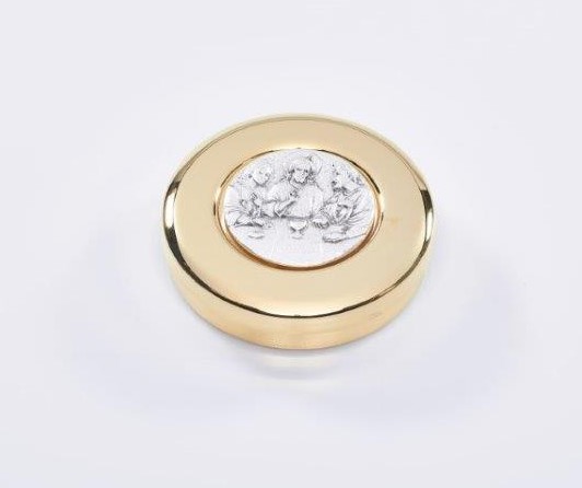 Hostiendose, vergoldet, Symbolfläche: das Letzte Abendmahl, abnehmbarer Deckel Maße: 7,5 x 2,5 cm