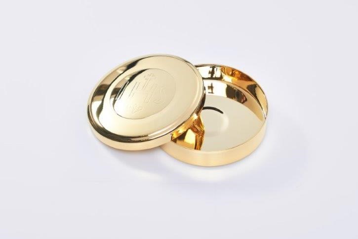 Hostiendose, Messing vergoldet, IHS auf Deckel, Maße: 7,5 x 2,5 cm