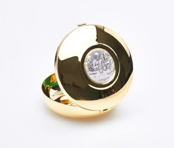 Hostiendose, vergoldet, Symbolfläche Motiv Abendmahl, mit Klappverschluß, Maße: 12 x 5 cm