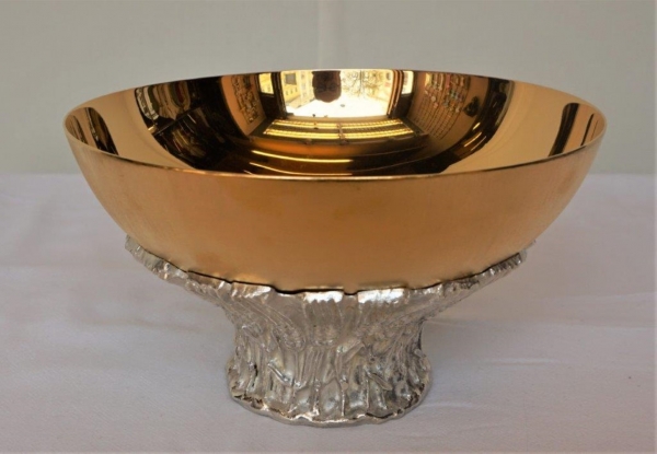 Hostienschale auf versilbertem Fuß, Cupa vergoldet, innen poiliert und außen matt, Durchmesser: 16 cm, Gesamthöhe: 9,5 cm, Motiv auf dem Fuß: Ähren, Einzelstück