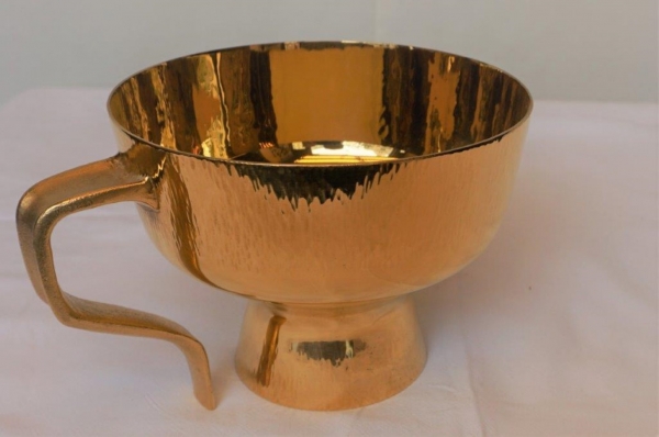Hostienschale mit Griff, aus Messing, vergoldet, gesamte Außenfläche ist gehämmert und poliert, der Griff ist matt vergoldet, Cupadurchmesser: 13 cm, Höhe: 10 cm