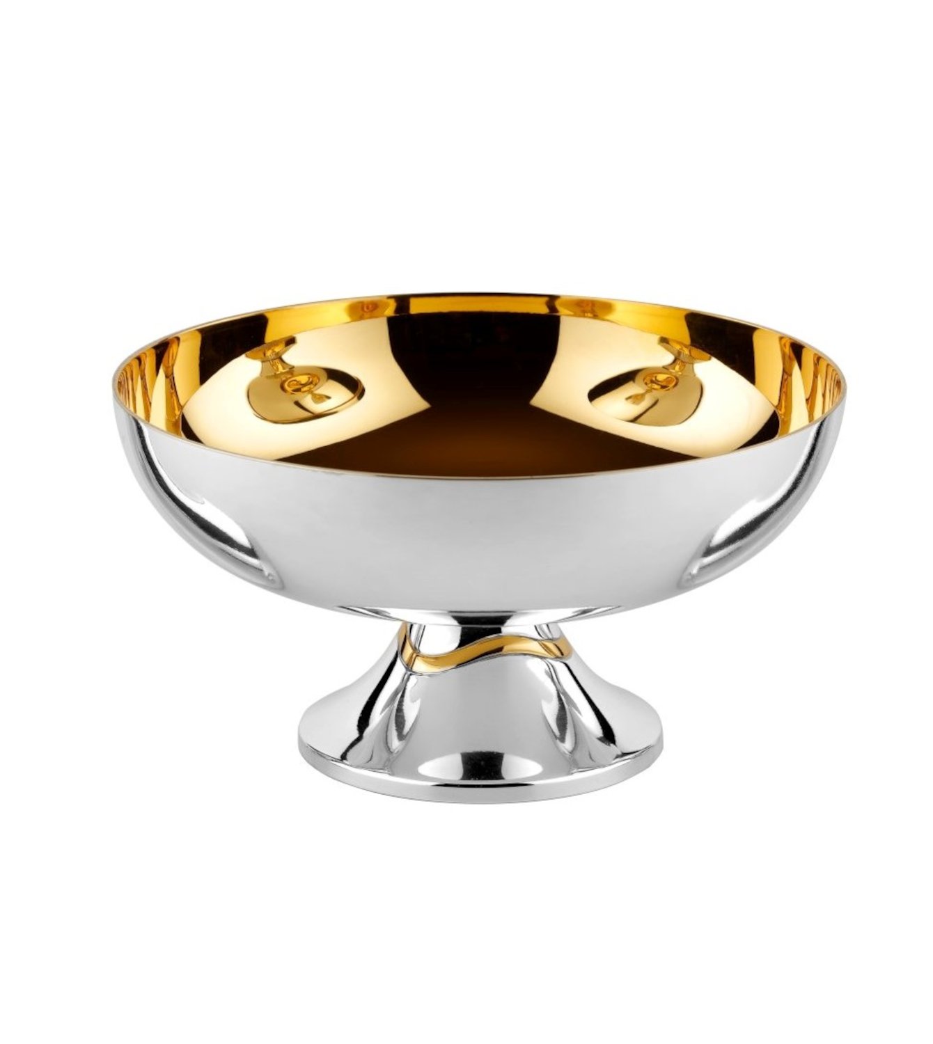 Hosteinschale aus Messing, außen versilbert, innen vergoldet, poliert, am Nodus ist eine geschwungene vergoldete Linie eingelassen, für ca 375 Laienhostien, Höhe: 9 cm, Durchmesser: 17 cm. Diese Hostienschale paßt zum Klech MO2210 (siehe dort!)