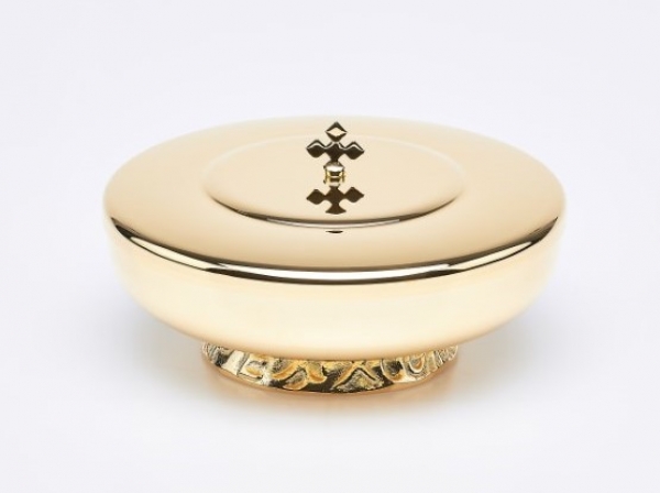 Hostienschale mit abnehmbarem Deckel, Material: Messing vergoldet, steht auf einem niedrigen Fuß. Diese Schale gibt es in 4 verschiedenen Größen: bitte wählen Sie aus!