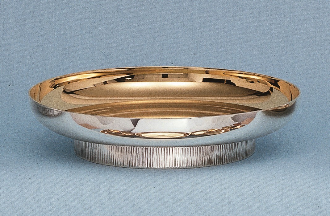 Brotpatene aus Messing. Innen vergoldet, außen versilbert, Fuß ist ziseliert. Patenengesamthöhe: ca 4 cm, Diese Patene wird mit verschiedenen Durchmessern angeboten. Bitte wählen Sie aus! Die Patene gibt es auch in der Variante innen und außen vergoldet. Dazu bitte ich um Kontaktaufnahme mit mir!