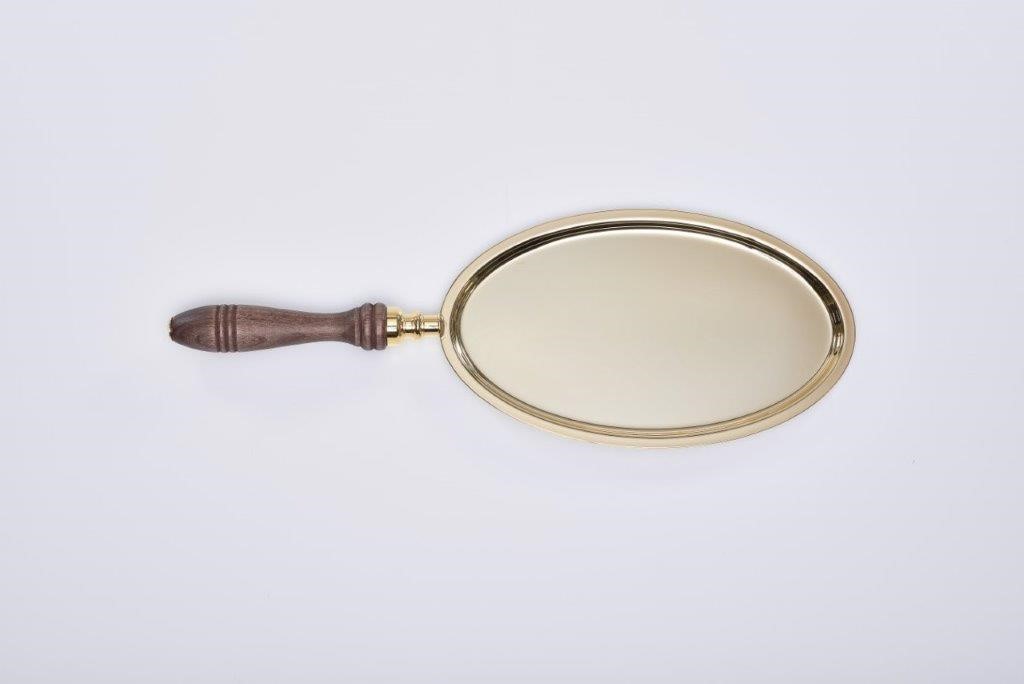 Kommunionspatene zum Unterhalten bei der Kommunionsgabe, mit Holzgriff, Tablett aus Messing, vergoldet, Maße des Tabletts: 23 x 14 cm, Grifflänge: 15 cm