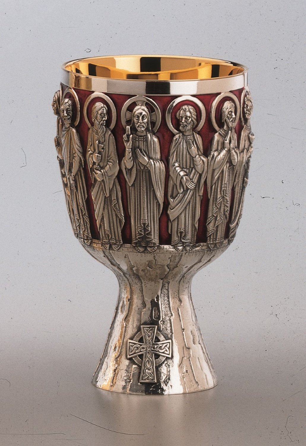 Kelch mit Patene (Durchmesser: 15 cm), Messing vergoldet, Kelch außen mit Emailmantel, darauf sind die 12 Apostel positioniert, Fuß versilbert, bearbeitet, Kreuz, Kelchhöhe: 18 cm, Cupadurchmesser: 11 cm