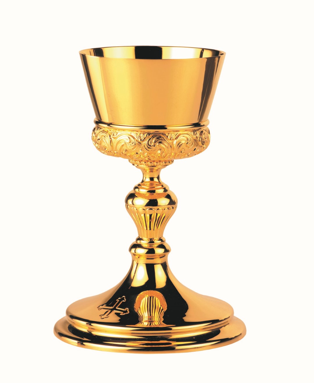 Kelch, Grundmaterial Messing, vergoldet, auf der Basis ist ein Kreuz eingraviert, Kelchhöhe: 20 cm, Cupadurchmesser: 10 cm